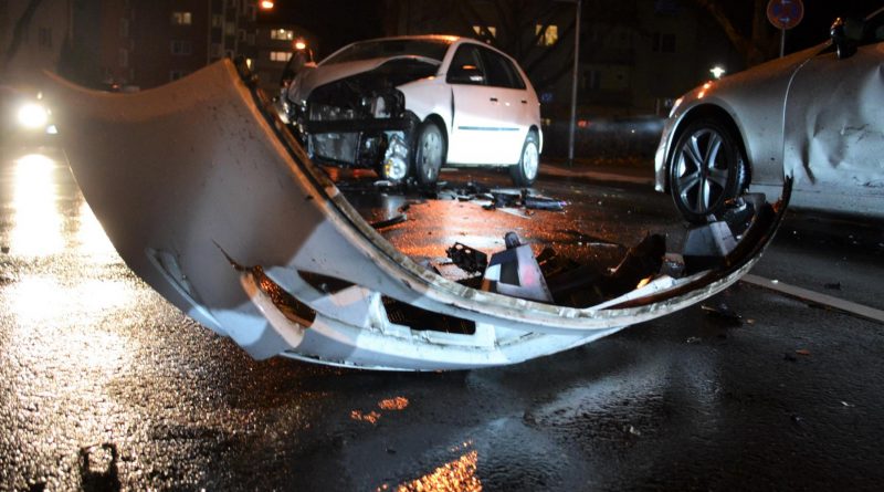 Fahrstreifen in gleicher Richtung fahrender 21jähriger VW-Führer erkannt dies zu spät und prallte auf den querstehenden Daimler Benz.