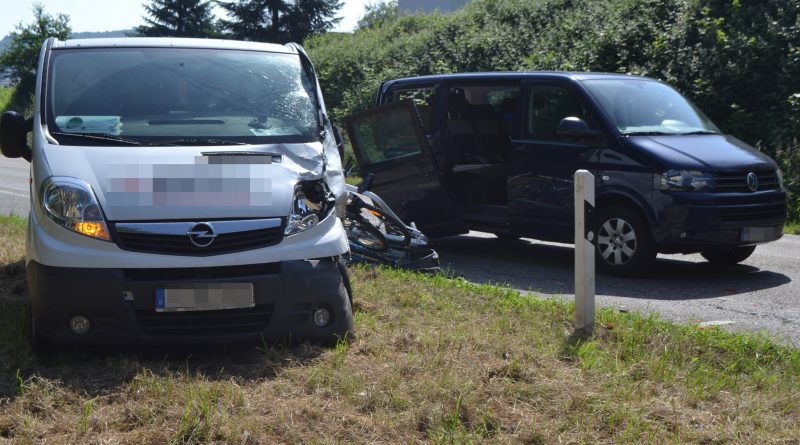 Bisher ist bekannt, dass der 43-jährige VW Bus-Fahrer direkt vor ihm und seine Beifahrerin leicht verletzt wurden. Ob deren drei mitfahrenden Kinder Verletzungen erlitten haben, kann noch nicht gesagt werden, da die Unfallbeteiligte eventuell beim Auftauchen von Beschwerden sich noch an einen Arzt wenden werden. Der Sachschaden wird auf rund 20.000 Euro geschätzt.